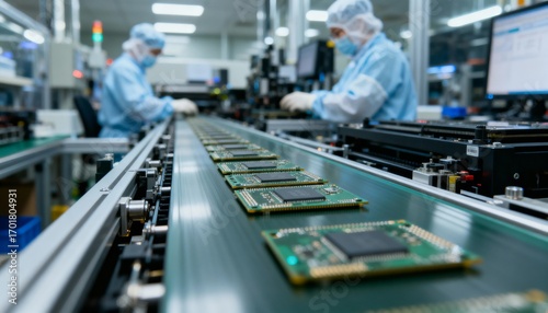 electronic, assembly, line, production, circuit, board, environment, manufacturing, technology, factory, industry, men at work, equipment, automated, machinery, precision, engineering, industrial, process, microchip, semiconductor, quality, control, inspection, sterile, science, research, development, innovation, automation, digital, high, tech