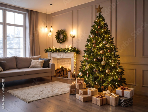 garland, wooden, year, happy, gift, beautiful, box, home, room, interior, holiday, christmas, living, design, house, tree, furniture, decor, stylish, apartment, december, winter, style, background, traditional, nobody, decoration, cosy, fireplace, chaplet, festive, indoor, celebration, gift, season, white, sofa