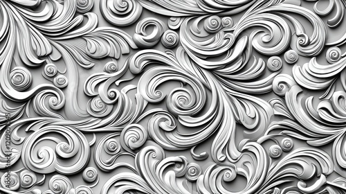 seamless, swirl, scroll, pattern, ornate, silver, grey, design, texture, wallpaper, decorative, three-dimensional, background, elegant, floral, abstract, art, illustration, embossed, relief, metallic, monochrome, style, luxury, vintage