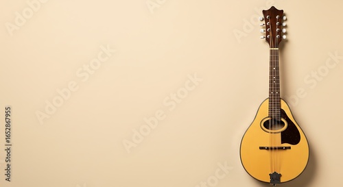 Elegant Acoustic Mandolin, a Classic Wooden String Instrument, Artfully Suspended Against a Warm, Plain Wall, Evoking Musical Harmony and Artistic Inspiration with Ample Copy Space.