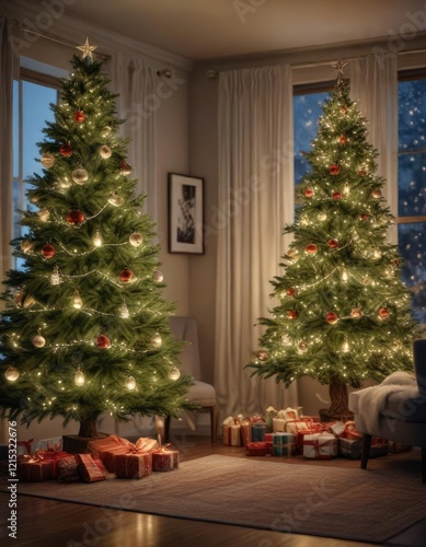Elegant and sophisticated ambiance with a beautifully decorated Christmas tree amidst glowing holiday lights, lights, holiday, elegant