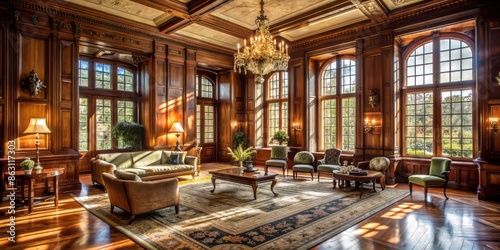 Elegant antique furnishings adorn a spacious room with high ceilings, rich wood paneling, and large windows bathing in warm, soft, afternoon natural light.
