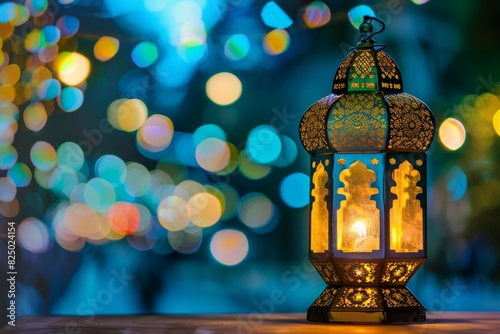 Elegant arabesque lantern glowing on table in enchanting ambiance with beautiful blurred background
