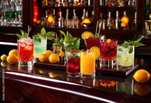 elegant arrangement vibrant cocktail ingredients luxurious bar top showcasing color texture stylish presentation, colors, glass, fruits, herbs, garnishes