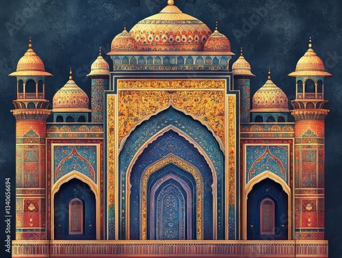 Elegant Art Deco Inspired Design Elements of Traditional Indian Architecture Featuring Ornate Details and Rich Colors