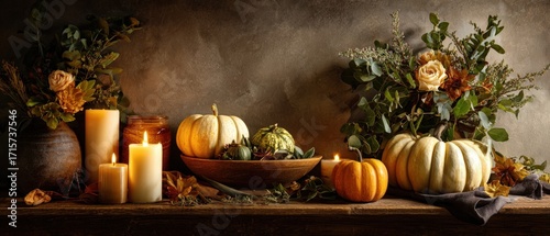 Elegant autumnal display with pumpkins candles flowers and rustic decor for fall harvest celebration or Thanksgiving decoration