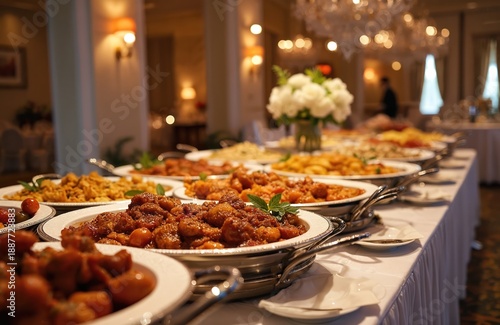 Elegant banquet hall with buffet tables laden with diverse cuisine. White flowers centerpiece adorns long table with steaming dishes ready for guests. Luxurious indoor event setting.