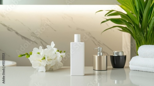 Elegant Bathroom Still Life with Spa Essentials Featuring a White Bottle, Green Plant, Soft Towels, and Fresh Flowers Set Against a Marble Background for Relaxation and Rejuvenation