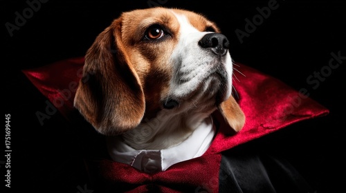 dog, beagle, pet, animal, canino, portrait, portraiture, furry, adorable, cute, face, head, closeup, head shot, elegance, style, fashion, costume, cape, velvet, bow tie, proud, noble, majestic, sophisticated, posh, head shot, animal portrait, domestic, loyal, friendly, expressive, ambitious, beautiful, charming, black background, spotlight, detailed