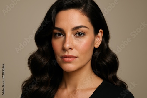 Elegant beauty portrait with voluminous wavy brunette hair and refined soft glam makeup
