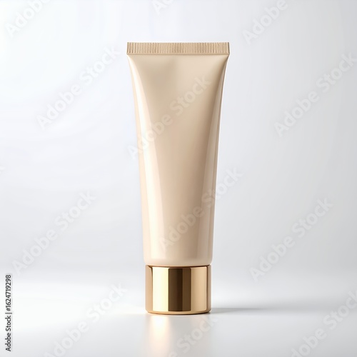 Elegant beige cosmetic cream tube with a shimmering golden base product shot on white background