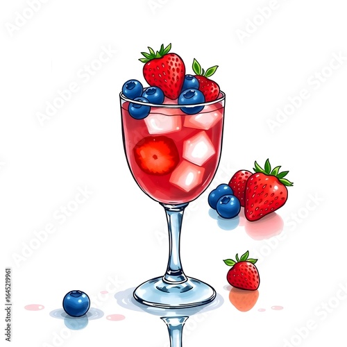 Elegant Berry Gin Cocktail: Realistic Minimalist Presentation with Fresh Strawberries & Blueberries on Clean Negative Space Background