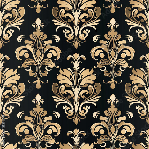 Elegant black and gold damask pattern featuring intricate floral designs.