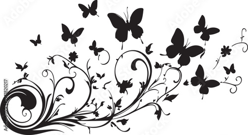 Elegant Black and White Butterfly and Floral Swirl Design Element Featuring Delicate Vines Flowers and Butterflies in a Decorative Arrangement Perfect for Graphic Design and