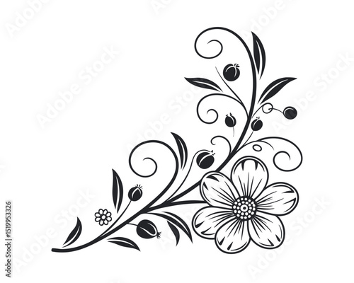 floral, corner, design, element, black, white, monochrome, flower, leaf, swirl, curl, vintage, retro, classic, elegant, decorative, ornamental, illustration, vector, graphic, art, pattern, border, frame, background, template, design element, floral pattern, wedding, invitation, card, decoration, botanical, spring, summer