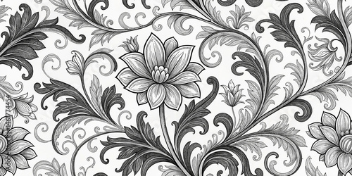 damask, floral, pattern, seamless, black, white, monochrome, elegant, vintage, classic, design, background, texture, wallpaper, fabric, textile, print, illustration, graphic, vector, scroll, leaf, flower, ornament, decorative, stylish, luxury, art, detailed, intricate, repeating, surface, design element, floral pattern
