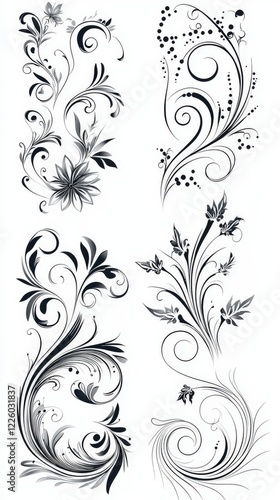 floral pattern, swirl, design element, black-and-white, monochrome, elegant, sophisticated, graceful, ornate, vintage, retro, classic, decorative, pattern, texture, background, illustration, graphic design, vector, art, style, flourish, scroll, blossom, flower, leaf, botanical, nature, beauty, aesthetic, artistic, detailed, intricate, delicate, wallpaper, scrapbooking, craft, bricolage, printable, template, hi-res, clip art