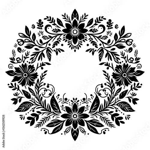 vector, chaplet, floral, black, white, silhouette, design, ornamental, flower, leaf, circle, pattern, detailed, elegant, decorative, border, botanical, flourish, nature, art, graphic, symmetry, illustration, isolated, arrangement