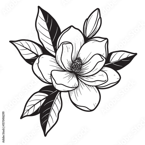 Elegant black and white magnolia flower with detailed leaves vector illustration