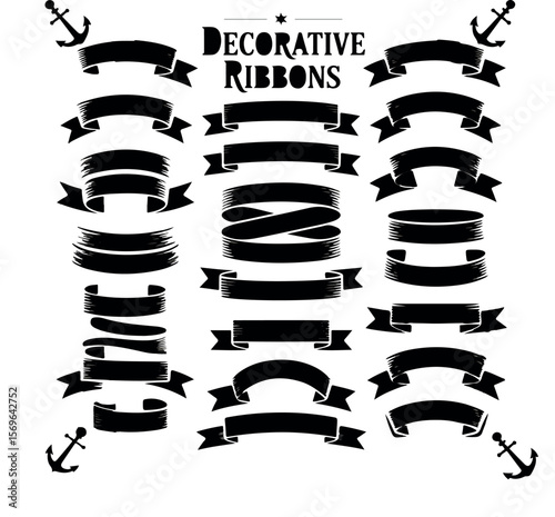 Elegant Black Decorative Ribbons and Anchors Collection Banner Emblems for Celebrations and Nautical Designs Vintage Style