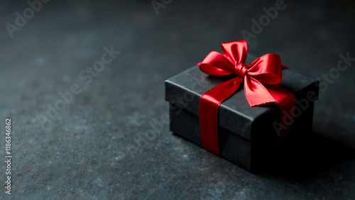 Elegant black gift box tied with red ribbon and bow on textured black background
