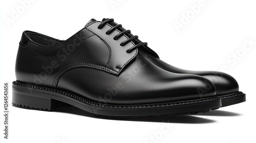 Elegant black leather dress shoes positioned on a clean surface for a fashion display