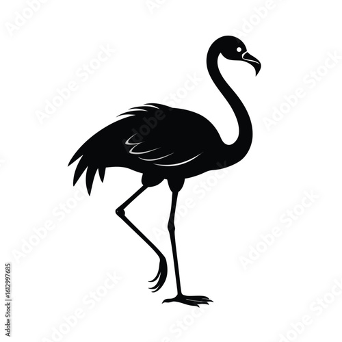 Elegant black silhouette of a flamingo gracefully standing on one leg against a clean background