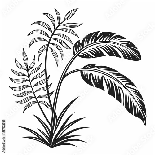 palm leaf, foliage, black-and-white, hi-res, graphic design, web design, versatile, white background