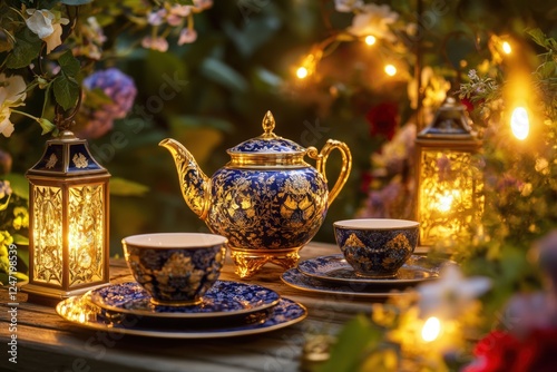 tea, set, garden, lantern, elegant, blue, gold, enchanted, dusk, table, cup, teapot, floral, porcelain, delicate, design, glowing, light, evening, peaceful, serene, warm, inviting, cosy, decorative, intricate, vintage, luxurious, ornate, ambience, dining, romantic, botanical, foliage, pottery, bloom, artwork, crafted, stylish, detailed, beauty, classic, refined, soothing, natural