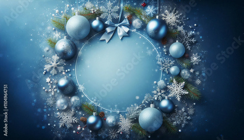 Elegant blue Christmas wreath with snowflakes, baubles, and pine branches on a frosty blue background, perfect for festive decoration