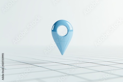 Elegant blue map pin hovering over a white grid map, symbolizing navigation tools and travel planning in a clean design