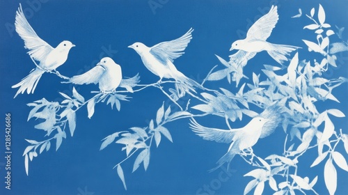 Elegant Botanical Design Featuring White Silhouettes of Plants and Birds Against a Deep Blue Background, Evoking Tranquility and Nature