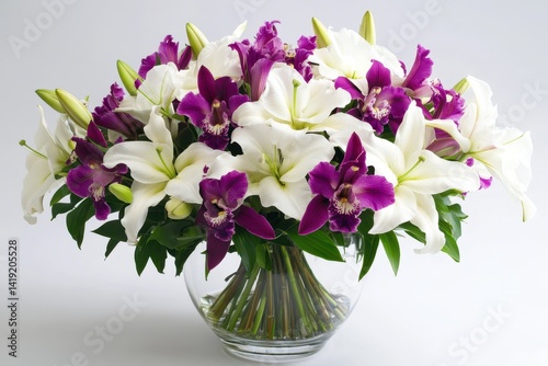Elegant bouquet of white lilies and purple orchids in a glass vase.