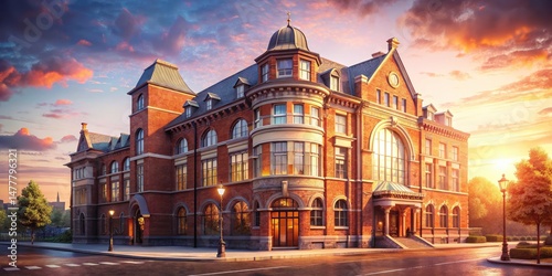 Elegant Brick Building: Classic Architecture Photography, Urban Sophistication, Historic Design, Large Windows