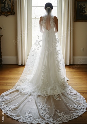 wedding, bride, dress, veil, lace, bridal, gown, white, long, elegant, woman, back, view, interior, window, room, floor, wooden, photo, portrait, classic, romantic, beautiful, fashion, style, ceremony, marriage, couple, love, happy, event, day, celebration, family, in, preparation, getting, ready