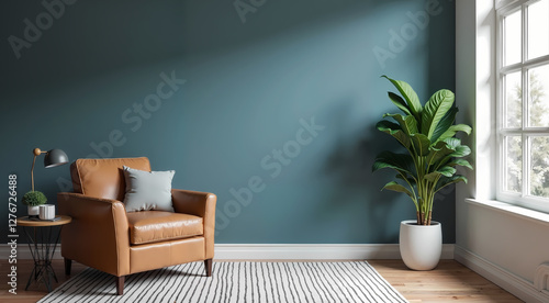 Elegant brown leather armchair in a modern living room with dark blue walls and warm lighting. Ideal for luxury home decor and furniture branding.