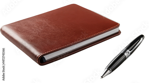 Elegant brown leather notebook with a sleek black pen on a simple background, perfect for note-taking and journaling at any time