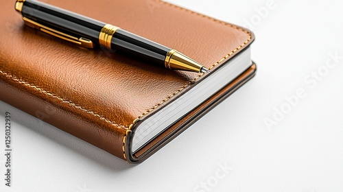 Elegant Brown Leather Notebook With Gold Pen Placed on White Background for Office Use