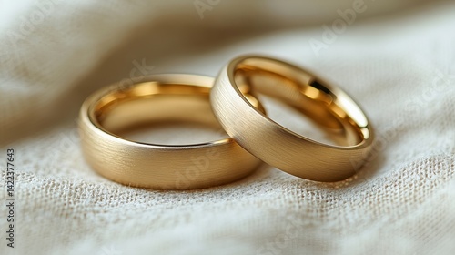 Elegant brushed gold wedding rings on soft fabric background love band matte macro metal style image