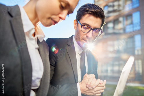 business, people, businessman, businesswoman, man, woman, talking, colleague, associate, summer, urban, teamwork, job, meeting, manager, profession, professional, employee, young, paper, reading, sunny, collaboration, explaining, sunlight, flare, eyeglass, elegant