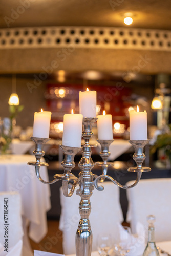 Elegant candelabra with lit candles at a beautifully set dining table in a warm restaurant during an evening event