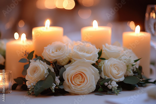 Elegant candle centerpieces with white roses create romantic atmosphere. soft glow of candles enhances beauty of floral arrangement, perfect for special occasions
