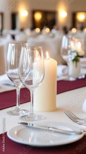 wedding reception, elegant, romantic, luxury, fine dining, eatery, hotel, banquet, table setting, candle, silverware, wine glass, china, blurred background, sophisticated, celebration, event, marketing, photo, commercial, business