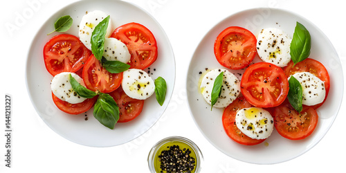 caprese, salad, tomatoes, mozzarella, basil, fresh, italian, healthy, vegetarian, epicure, delicious, cookery, plate, food, receipe, culinary, nourishment, simplicity, mediterranean, vibrant, colourful, ripe, sliced, organic, cheese, leaf, gastronomy, dining, aromatic, pepper, spice, condiment, presentation, arrangement, elegance, minimalist, dark, white, circular, dish