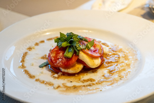italian cuisine, basil, colourful, fine dining, fresh vegetable, garnish, gourmet food, healthy eating, salad, tomatoes, vegetarian, white plate