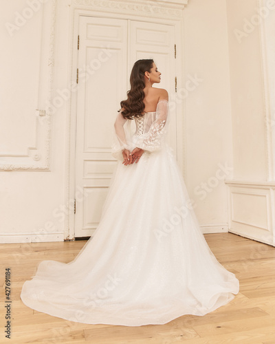 Elegant caucasian woman with natural make-up and hairstyle wearing white bridel dress, standing and posing in bright stylish interior. Full length portrait