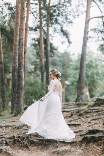 Elegant ceremony in European style. Beautiful bride in white flying dress in the forest.