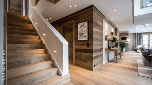 Elegant chalet interior showcases luxury with wooden staircase, wall panels, and framed artwork enhancing comfort.
