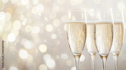 Elegant champagne flutes, filled with bubbly, against a New Year's backdrop featuring soft-focus bokeh lights and confetti