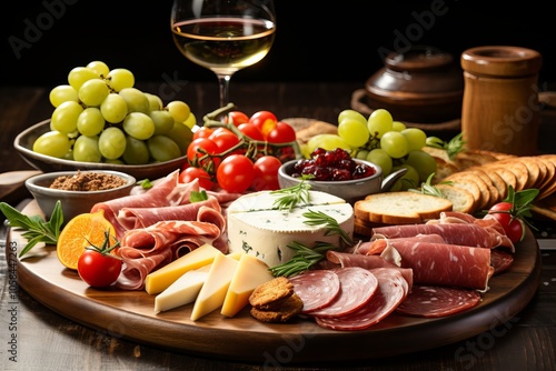 charcuterie, board, meat, cheese, wine, grape, tomatoes, gathering, evening, platter, appetiser, snack, fresh, festive, herb, cherry, sweet, savoury, social, entertainment, cheese, hospitality, food, presentation, rustic, epicure, culinary, celebration, pairing, favor, art, enjoyment, dining, table, setting, relaxing, indulgence, party, gathering, entertaining, seasonal, colourful, hors, crunch, delicacy, treat, fruit, delicious
